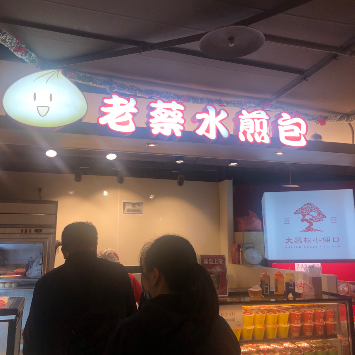- 描述: 一張清晰拍攝「老蔡水煎包」招牌,前方有熱鬧排隊人潮的街景照片,背景可見台北車站周邊的繁忙。