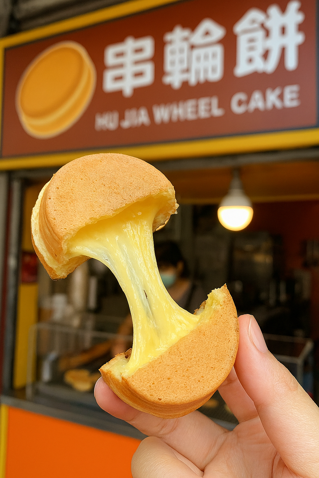 • [Image of: 胡家車輪餅,特寫兩個車輪餅的切面,內餡飽滿溢出。]