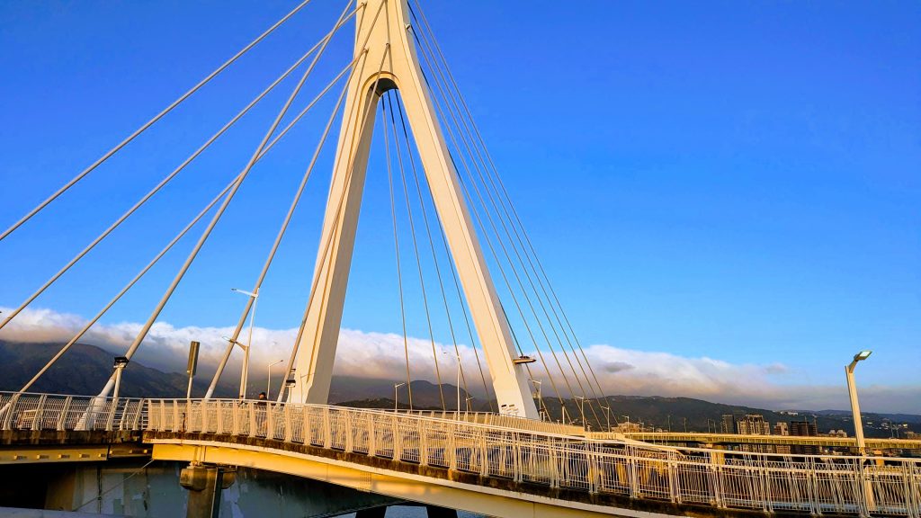 社子大橋的設計兼具現代感與實用性,橋身簡潔流暢,白色的橋樑與湛藍的天空、河水交織成一幅美麗的畫面。傍晚時分,夕陽餘暉照射在橋面上,光影交錯,形成了獨特的景色,讓人不禁駐足欣賞。在這裡,駕車或是騎車過橋,都能感受到一種與自然融為一體的舒適氛圍。