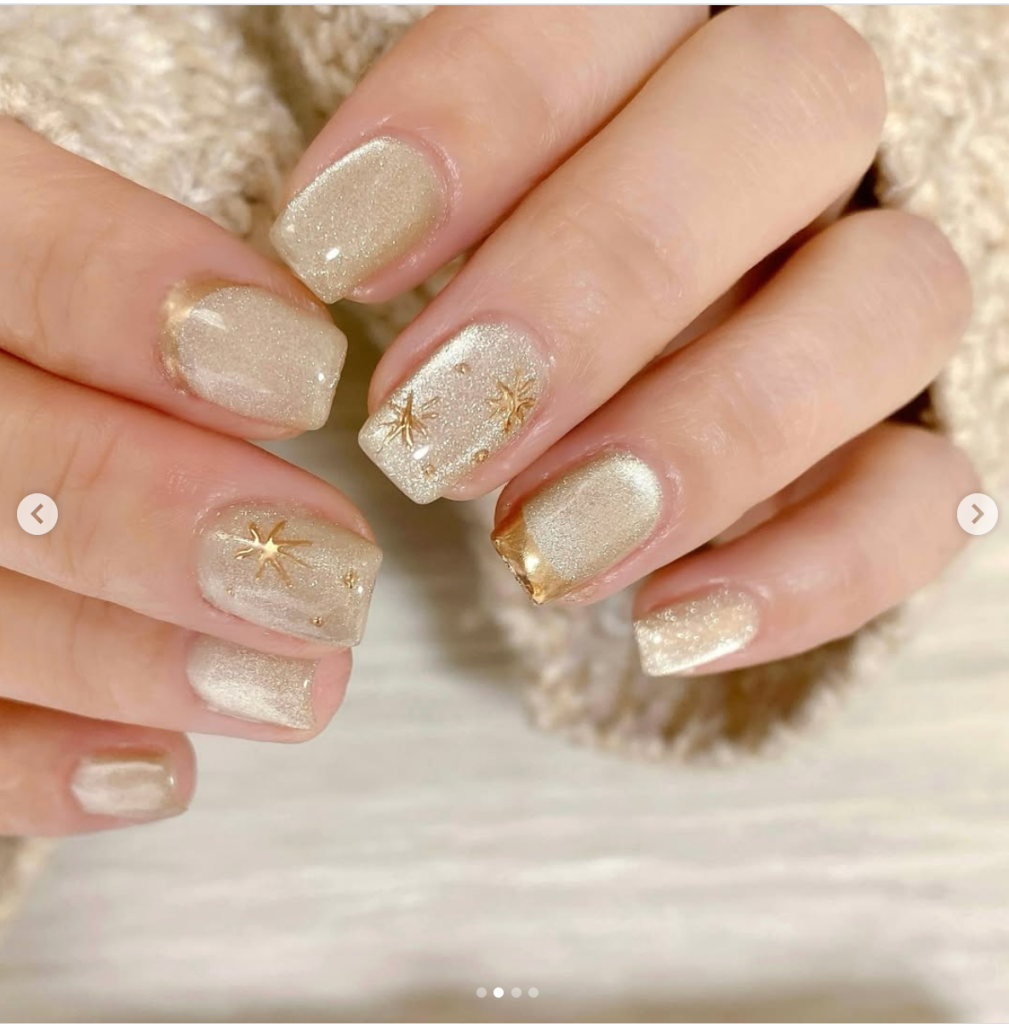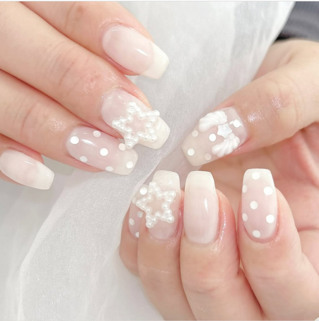乳白色打底搭配細緻小珍珠,展現高級感與溫柔氣質。珍珠的圓潤光澤與純白色調相互輝映,為整體造型增添典雅柔美的氛圍,同時帶來一絲夢幻感。當小珍珠排列組合成立體星星圖案時,不僅增添精緻度,也讓指尖更具層次感,宛如夜空中閃爍的星辰,低調中流露出華麗氣息。這款設計適合各種場合,無論是日常、約會,還是重要節日,都能讓手部更顯精緻迷人。