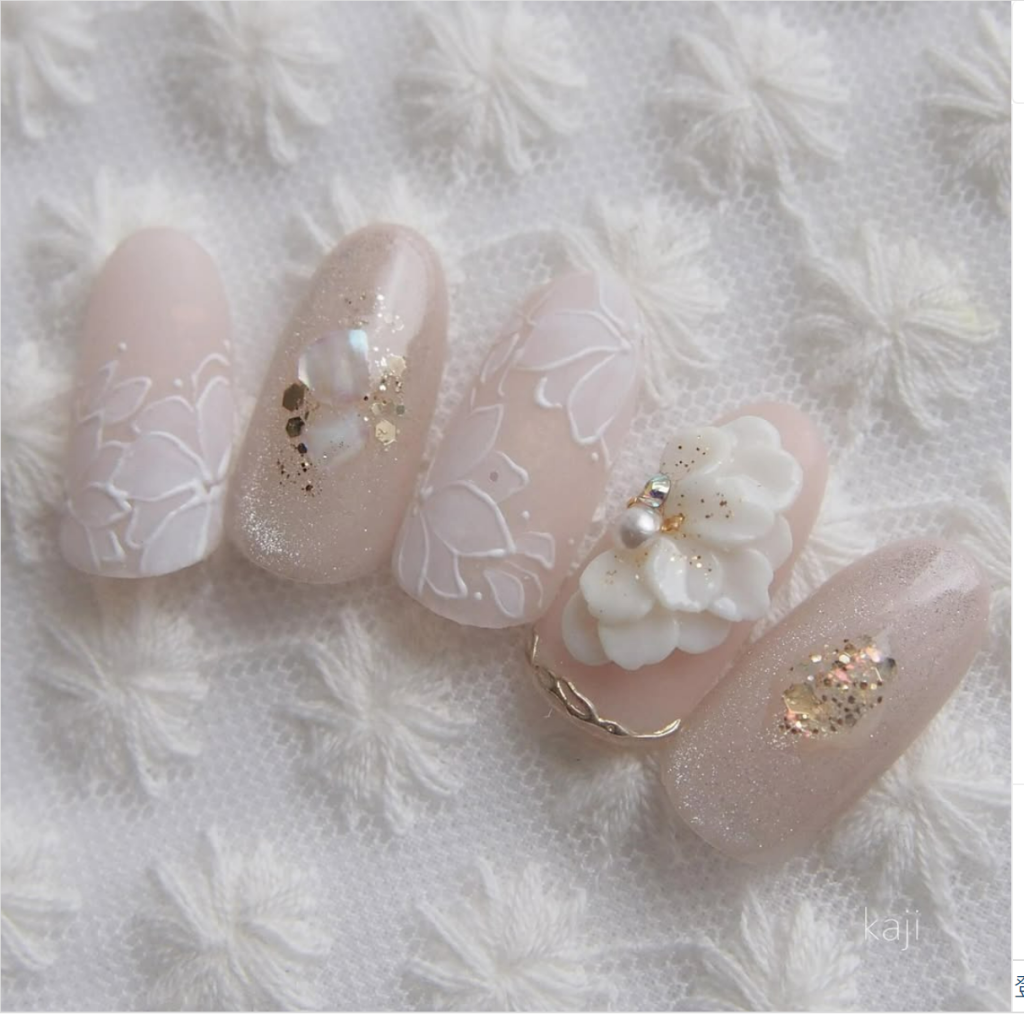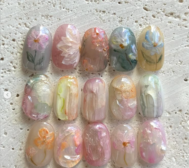 在這款美甲設計中,最吸睛的部分莫過於精緻的立體花瓣設計。層層堆疊的立體花瓣營造出彷彿鮮花綻放的效果,增添立體感與細緻度,讓指尖宛如綻放的花朵,散發出夢幻迷人的氣息。立體花瓣的設計細膩且富有層次感,讓每一個手部動作都彷彿流轉著春日的柔美氣息。筆觸勾勒出花瓣的優雅線條,使美甲更具藝術感與個性化。手繪花瓣與立體花瓣相互呼應,營造出豐富的層次變化,使整體設計更顯精緻且充滿春日氛圍。