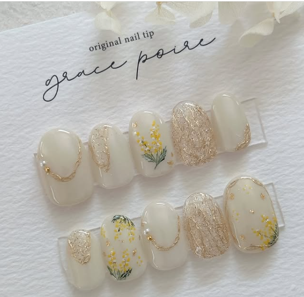 淡雅細緻的黃色調,如同春日晨光般輕柔灑落,展現出春天的溫暖與生機勃勃的活力感。這款美甲設計以溫柔的黃色作為主色,搭配細膩優雅的黃色乾燥花,宛如春日盛開的花朵,為整體造型增添了一抹自然與浪漫的氛圍。金色絲線點綴其中,猶如陽光輕輕滑過指尖,折射出低調卻迷人的光澤,細膩又富有質感。這樣的設計不僅溫柔夢幻,更展現出精緻優雅的氣質,無論是日常搭配還是特別場合,都能輕鬆駕馭,絕對是溫柔女生不可錯過的必備美甲款式。
